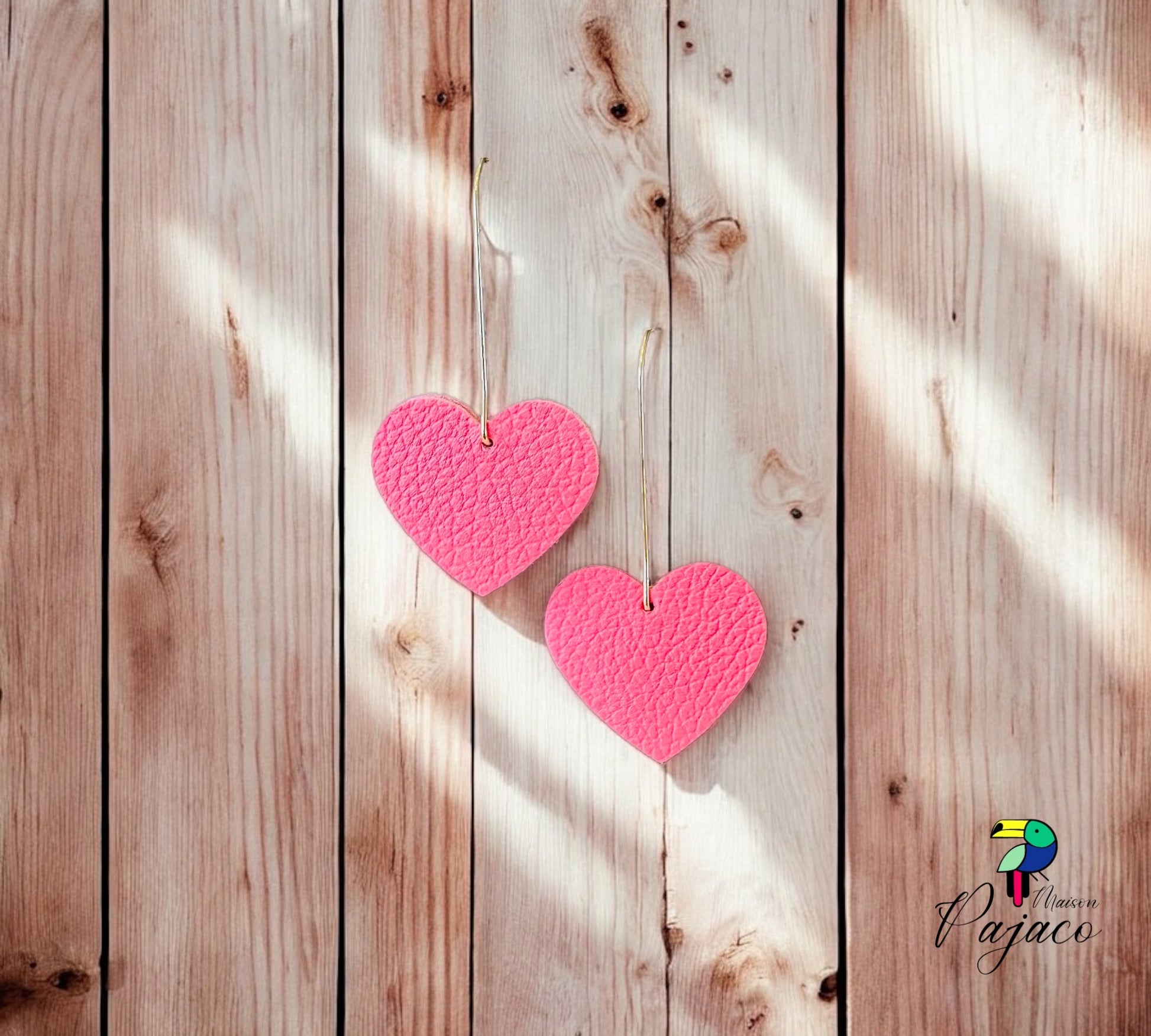 Conçues en cuir souple découpé en forme de cœur, elles sont identiques recto/verso et montées sur un crochet de 3,3 cm qui leur donne un mouvement fluide et aérien.