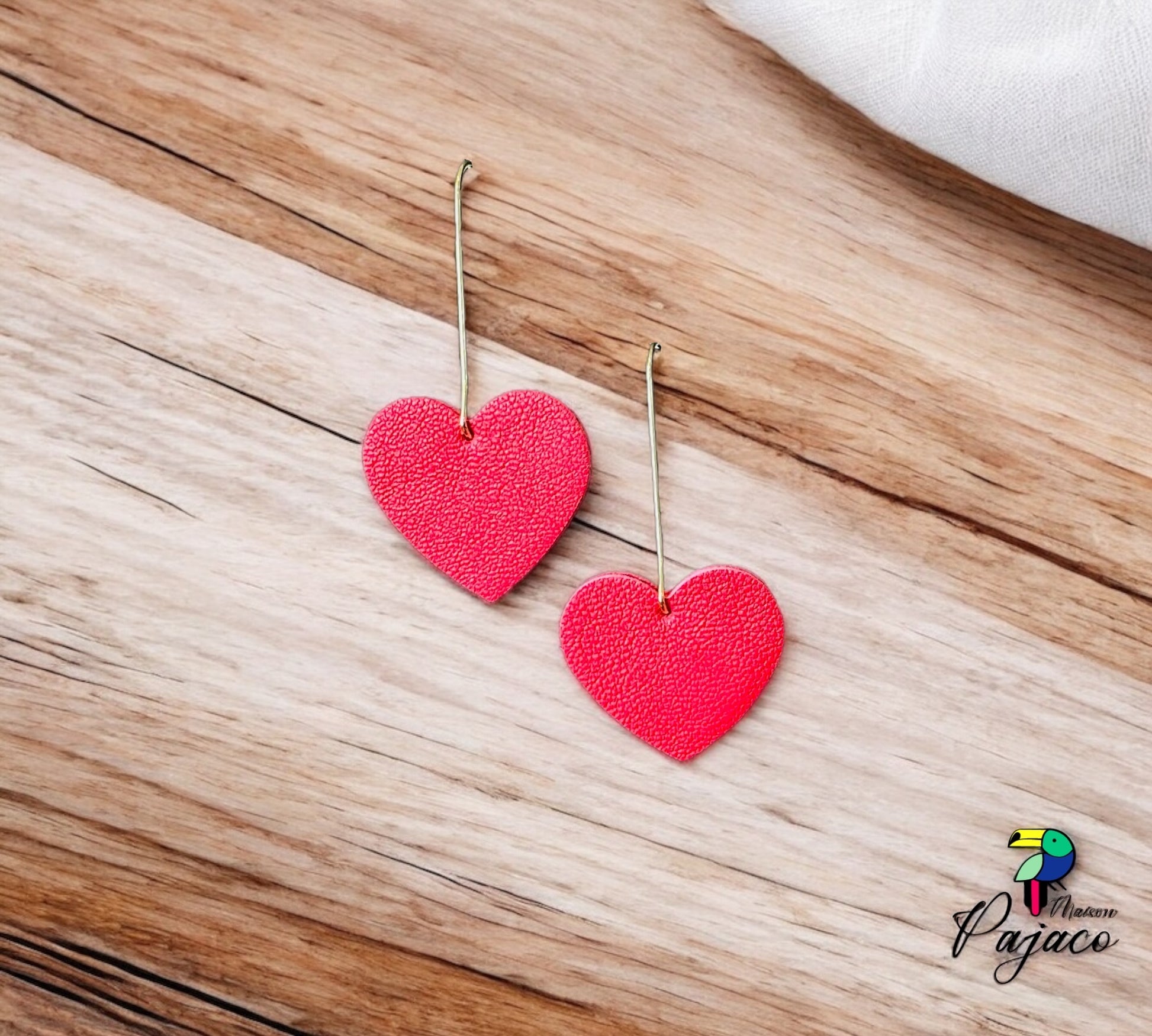 Conçues en cuir souple découpé en forme de cœur, elles sont identiques recto/verso et montées sur un crochet de 3,3 cm qui leur donne un mouvement fluide et aérien.
