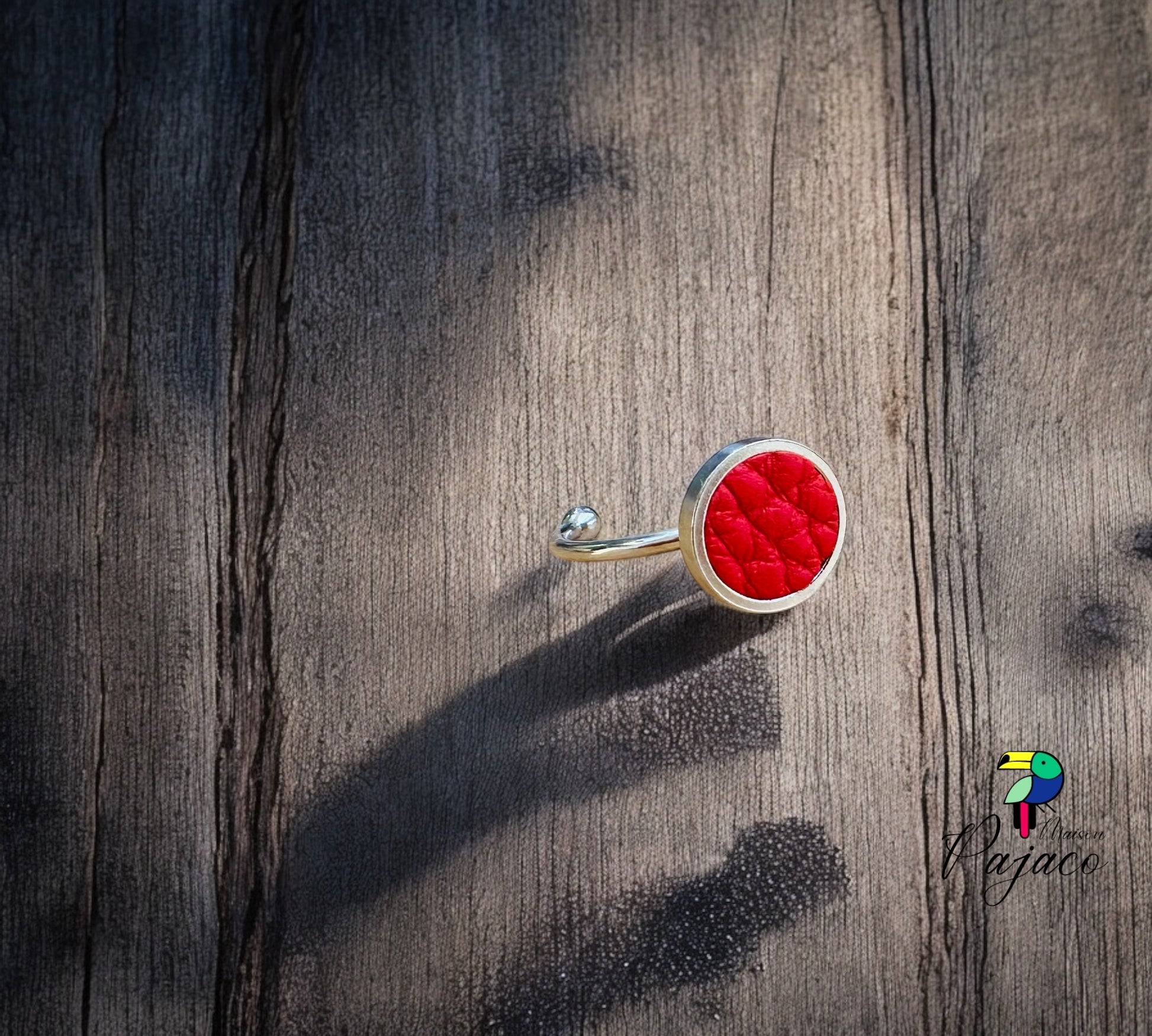 Bague argentée - Cuir rouge