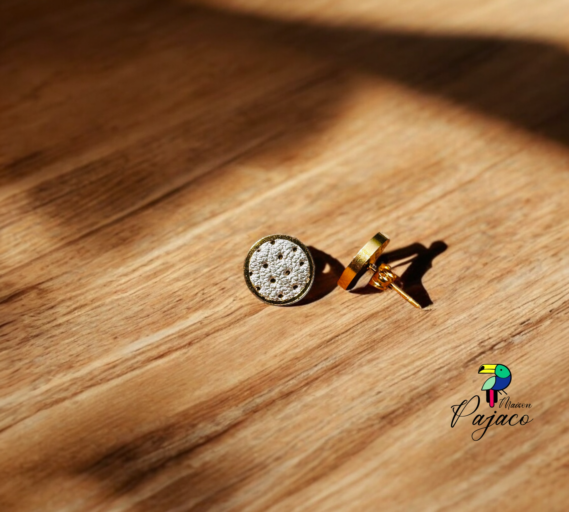 Puces d’oreilles dorées, fabriquées à la main avec des cuirs recyclés.